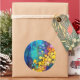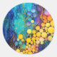 A painting features vividly coloured bubbles against a deep blue background in a geometric abstract style. The colours are rich and vibrant, creating an eye-catching and dynamic visual.