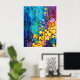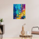 A painting features vividly coloured bubbles against a deep blue background in a geometric abstract style. The colours are rich and vibrant, creating an eye-catching and dynamic visual.