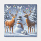 A carrot-nosed snowman in a frosted black hat smiles between two buck deer. One deer cheerfully blows colourful transparent bubbles into the snowy sky, as flying white turtle doves look on against a cloudy grey backdrop.