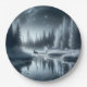 A serene winter night is depicted with a deer standing by a reflective river surrounded by snow-covered trees