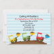 Start your celebration off right with this adorable construction invitation. It's perfect for that truck lover or that little construction man in your life. It has three colourful bucket loaders with dirt in them each. One is yellow, green and red. The background is a light blue stripe. Check out the many other designs and products in this line. ©babystar