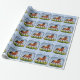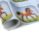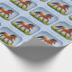 Wild buckskin horse galloping across a grassy plain. Accented with a pretty sky blue patterned background.