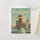 This elegant vintage poster captures a woman in a classic 1950s dress standing gracefully by the Danube River, with the majestic Budapest Parliament building rising in the background. The scene is bathed in warm, nostalgic tones with soft retro textures, evoking the timeless charm of mid-century Budapest. The flowing river, historic architecture, and vintage fashion combine to create a romantic and sophisticated travel artwork—perfect for lovers of classic European cities and vintage style.
