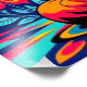 A golden Buddha statue is depicted in front of a vibrant backdrop of red and yellow splatters, creating a striking visual contrast. The serene expression on the Buddha's face adds a sense of peace amid the dynamic colors.
