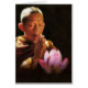 Pink lotus with buddhist monk in prayer in a soft textured image.