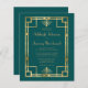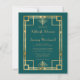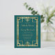 This elegant vintage deco-inspired wedding invitation features gold-coloured text on a teal blue background, framed by a rectangular geometric vintage art deco design. The reverse side provides space for wedding details on a solid teal background, along with a QR code guests can scan to visit your website and RSVP, which saves the cost of printing and mailing separate RSVP cards.