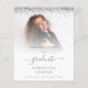 A value for money BUDGET alternative on a smaller size 4.5 x 5.6” semi-gloss 110lbs weight, which is of similar thickness to a postcard (however is not suitable to use as a postcard.). PLEASE NOTE there is ONE invite per sheet. Budget 2022 Graduation Photo Silver Glitter Announcement. Elegant faux glitter borders are at the top on both sides. Graduate is in a stylish script with swashes. Easily personalise the text to your own requirements including on the reverse, and replace the sample image with your own.