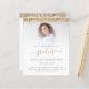 A value for money BUDGET alternative on a smaller size 4.5 x 5.6” semi-gloss 110lbs weight, which is of similar thickness to a postcard (however is not suitable to use as a postcard.). PLEASE NOTE there is ONE per sheet. Budget 2023 Graduation Photo Gold Glitter Party Invitation. Glam gold faux glitter borders are at the top on the both sides. Graduate is in an elegant script with swashes. Easily personalise the text to your own requirements, and replace the sample image with your own. To keep the minimalist contemporary look of this design, a photo with a light colored background will work well.