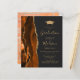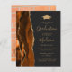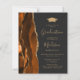 This trendy 2025 graduation party invitation features a watercolor image of burnt orange and rust agate geode with faux gold glitter highlights. The word "Graduation" and the graduate's first name appear in elegant gold-coloured handwriting script on an off-black background, along along with a gold-coloured mortar board cap and party details in sans serif and italic fonts. Easily replace the sample image on the back with a vertical photo of the graduate.