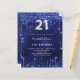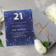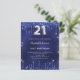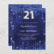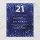 A modern, stylish and glamourous invitation for a 21st birthday party. A navy blue background, decorated with faux glitter dust. The blue colour is uneven. Personalise and add your name and party details. Number 21 is written with a balloon style font, script, silver coloured.