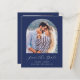 This simple, minimalist Save the Date card features a boho photo arch above the words "Save the Date" in elegant white handwriting script, followed by the couple's names, wedding date and city in sans serif font on a navy blue background. Add a horizontal photo and a more detailed message with additional information on the back.