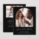 This simple, minimalist Save the Date card features a boho photo arch above the words "Save the Date" in elegant white handwriting script, followed by the couple's names, wedding date and city in sans serif font on a black background. Add a second, horizontal photo and a more detailed message with additional information on the reverse.