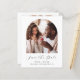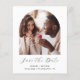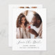 This simple, minimalist Save the Date card features a boho photo arch above the words "Save the Date" in elegant black handwriting script, followed by the couple's names, wedding date and city in sans serif font on a white background. Add a second, horizontal photo and a more detailed message with additional information on the reverse.