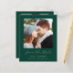 This simple, minimalist Save the Date card features a square photo above the words "Save the Date" in elegant gold-coloured handwriting script, followed by the couple's names, wedding date and city in sans serif font on an emerald green background. Add a second, horizontal photo and a more detailed message with additional information on the reverse.