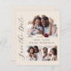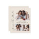 This simple, minimalist Save the Date card features a photo collage arch, with a horizontal photo at the top and two square photos at the bottom. The words "Save the Date" run vertically up the left margin in elegant black handwriting script. The couple's names, wedding date and city appear in between the photos in black sans serif font on a beige background. Add a more detailed message with additional information on the back.