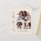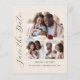 This simple, minimalist Save the Date card features a photo collage arch, with a horizontal photo at the top and two square photos below. The words "Save the Date" run vertically up the left margin in elegant black handwriting script. The couple's names, wedding date and city appear below the photo collage in sans serif font on a beige background. Add a more detailed message with additional information on the back, along with a QR code to help your guests visit your wedding website.