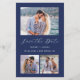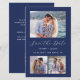 This simple, minimalist Save the Date card features a horizontal photo at the top and two square photos at the bottom. In between, the words "Save the Date" appear in elegant white handwriting script, followed by the couple's names, wedding date and city in sans serif font on a navy blue background. Add a more detailed message with additional information on the back, along with a QR code to help your guests visit your wedding website.