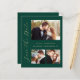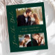 This simple, minimalist Save the Date card features a horizontal photo at the top and two square photos at the bottom. The words "Save the Date" run vertically up the left margin in elegant gold-coloured handwriting script. The couple's names, wedding date and city appear between the top and bottom photos in sans serif font on an emerald green background. Add a more detailed message with additional information on the back.