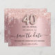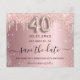 A girly and trendy Save the Date card for a 40th birthday party. Blush pink gradient background decorated with rose gold and faux silver glitter drips and dust. Personalise and add a date and name/text. The text: Save the Date is written with a large trendy hand lettered style script with swashes. Number 40 with a balloon style font.
