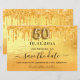 A girly and trendy Save the Date card for a 50th birthday party. A modern faux gold metallic looking background decorated with faux glitter drips, paint dripping look. Personalise and add a date and name. The text: Save the Date is written with a large trendy hand lettered style script. Number 50 with a balloon style font.