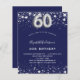 A modern, stylish and glamourous invitation for a 60th birthday party. A navy blue background, decorated with faux silver stars. Personalise and add your name and party details. Number 60 is written with a balloon style font.