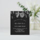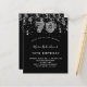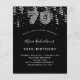 A modern, stylish and glamourous invitation for a 70th birthday party. A black background, decorated with silver confetti. The name is written with a modern hand lettered style script. Personalise and add your party details. Number 70 is written with a trendy balloon style font, leopard pattern.