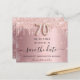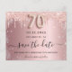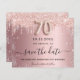 A girly and trendy Save the Date card for a 70th birthday party. Blush pink gradient background decorated with rose gold and faux silver glitter drips and dust. Personalise and add a date and name/text. The text: Save the Date is written with a large trendy hand lettered style script with swashes. Number 70 with a balloon style font.