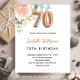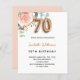 An elegant invitation for a 70th birthday party. A chic white background. Decorated with a rose gold and blush pink watercolored rose flower, floral, green eucalyptus leaves, sprigs, greenery and faux gold sprigs. Personalise and the name and party details. Black and golden letters. The name is written with a modern hand lettered style script. Number 70 is written with a golden balloon style font.