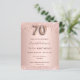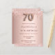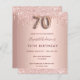 A modern, stylish and glamourous invitation for a 70th birthday party. A faux rose gold metallic looking background with an elegant faux rose gold glitter drip, paint drip look. The name is written with a modern dark rose gold coloured hand lettered style script. Personalise and add your party details. Number 70 is written with a balloon style font, script.