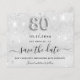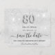 An elegant Save the Date card for a 80th birthday party. A modern faux silver metallic looking background decorated with faux glitter dust. Personalize and add a date and name/age. The text: Save the Date is written with a large trendy hand lettered style script. Number 80 with a balloon style font.