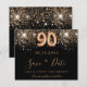 A girly and trendy Save the Date for a 90th birthday party. A black background decorated with faux gold glitter. Templates for a date and name and text. Golden coloured letters. The text: Save the Date is written with a large trendy hand lettered style script.