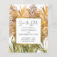 Will you be holding your wedding ceremony in the south or perhaps on the beach? Our colourful budget Save the Date card helps you set the scene with an abstract boho floral arrangement of pampas grass stalks in shades of gold, rose gold, and green. The "Save the Date" text illustration is set in an elegant script font and all other text on front and back of the card can be easily personalised by you on the template.