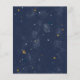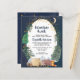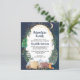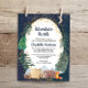 Budget-friendly rustic baby shower by mail invitation featuring a cute illustration of woodland animals with their tent camping in the mountains and forest, an overlay of gold stars and moon in a nighttime sky and "Adventure Awaits" and the mother-to-be's name in a dark midnight blue script. Easily personalise the shower by mail details.