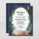 Budget-friendly rustic drive by baby shower invitation featuring a cute illustration of woodland animals by a tent camping in the mountains and forest, an overlay of gold stars and moon in a nighttime sky and "Adventure Awaits" and the mother-to-be's name in a dark midnight blue script. Easily personalize the drive by shower details.