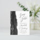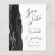The left-hand edge of this elegant modern wedding save the date card features a black watercolor agate border trimmed with faux silver glitter. The customisable text combines charcoal grey handwriting, copperplate and italic fonts on a white background. The reverse side features a matching black and silver agate design.