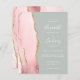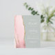 The left-hand edge of this elegant modern wedding invitation features a blush pink watercolor agate border trimmed with faux gold glitter. The customisable text combines white handwriting, copperplate and italic fonts on a pale sage green background. The reverse side features a matching blush and gold agate design.