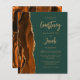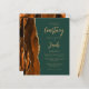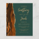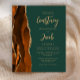 The left-hand edge of this elegant modern wedding invitation features a burnt orange watercolor agate border trimmed with faux gold glitter. The customisable text combines gold-coloured script, copperplate and italic fonts on a dark emerald green background. The reverse side features a matching burnt orange and gold agate design.