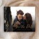 This elegant horizontal save the date card features a black watercolor agate border trimmed with faux gold glitter. Easily replace the sample image with your own photo of the future bride and groom. The customisable text combines gold-coloured handwriting script and copperplate font; a black gradient filter helps make the text pop. The back features a matching black and gold agate design.