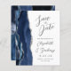 The left-hand edge of this elegant modern wedding save the date card features a navy blue watercolor agate border trimmed with faux silver glitter. The customisable text combines charcoal grey handwriting, copperplate and italic fonts on a white background. The reverse side features a matching navy and silver agate design.