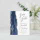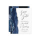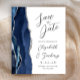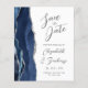 The left-hand edge of this elegant modern wedding save the date card features a navy blue watercolor agate border trimmed with faux silver glitter. The customisable text combines charcoal grey handwriting, copperplate and italic fonts on a white background. The reverse side features a matching navy blue and silver agate design.