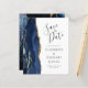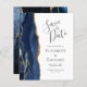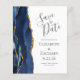 The left-hand edge of this elegant modern wedding save the date card features a navy blue watercolor agate border trimmed with faux gold glitter. The customisable text combines charcoal grey handwriting, copperplate and italic fonts on a white background. The reverse side features a matching navy blue and gold agate design.
