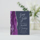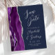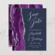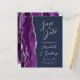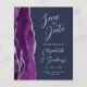 The left-hand edge of this elegant modern wedding save the date card features a purple watercolor agate border trimmed with faux silver glitter. The customisable text combines silver grey handwriting, copperplate and italic fonts on a navy blue background. The reverse side features a matching purple and silver agate design.