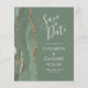 The left-hand edge of this elegant modern wedding save the date card features a sage green watercolor agate border trimmed with faux gold glitter. The customisable text combines ivory handwriting, copperplate and italic fonts on a sage green background. The reverse side features a matching sage green and gold agate design.