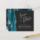 This elegant budget save the date card features a teal blue watercolor agate border trimmed with faux silver glitter. The customisable text combines silver grey handwriting script, copperplate and italic fonts on an off-black background. The reverse side features a matching teal and silver agate design.
