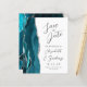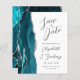 The left-hand edge of this elegant modern wedding save the date card features a teal blue watercolor agate border trimmed with faux silver glitter. The customisable text combines charcoal grey handwriting, copperplate and italic fonts on a white background. The reverse side features a matching teal and silver agate design.