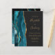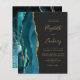 The left-hand edge of this elegant modern wedding invitation features a teal watercolor agate border trimmed with faux gold glitter. The customizable text combines gold colored handwriting, copperplate and italic fonts on a dark charcoal gray background. The reverse side features a matching teal and gold agate design.