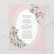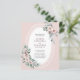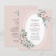 Budget Boho Dusty Pink Floral Roses and Eucalyptus Watercolor Greenery Lace Oval Wedding Invitation... Our affordable "All in One" floral wedding invitation features dusty pink roses and eucalyptus greenery on a white lace oval frame displaying your personalised invitation text. The back of the invitation contains all of the details you would typically see on separate cards within the wedding packet. The background on front and back of the invitation is romantic blush pink. This modern style front and back wedding invitation was designed to be both elegant and budget conscious... not to mention time-saving. All example text can be easily revised with your own information on the personalisation template.