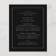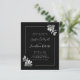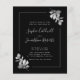 Budget All in One Silvery Grey Eucalyptus Elegant Black Wedding Invitation... Our affordable "All in One" botanical wedding invitation features a silvery grey text frame with faux silver eucalyptus branches bordering your invitation text on an elegant black background. The back of the invitation contains all of the details you would typically see on separate cards in the wedding packet. This modern style wedding invitation was designed to be both elegant and budget conscious... not to mention time-saving. All example text can be easily revised with your own information on the personalisation template.