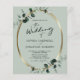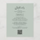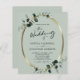 Budget Eucalyptus Gold All in One with Details on Back QR Code RSVP Sage Wedding Invitation... Our affordable "all in one" botanical front and back wedding invitation features a faux gold oval frame embellished with emerald-hued eucalyptus leaves on a light sage background. Chic modern calligraphy displays the text for "the Wedding of", "and" as well as "reception to follow" accompanied by elegant serif typography for the text you can personalise. The sage back of the invitation contains all of the details you would typically see on separate cards in the wedding packet. This modern style wedding invitation was designed to be both elegant and budget conscious... not to mention time-saving for busy brides-to-be. On the back there is also a QR code graphic template you can replace with your own code just by typing in your wedding website URL. All example text (aside from the calligraphy graphics) can be easily revised with your own information on the personalisation template.