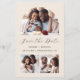 This simple, minimalist Save the Date card features an arch-shaped photo at the top and two square photos at the bottom. In between, the words "Save the Date" appear in elegant black handwriting script, followed by the couple's names, wedding date and city in sans serif font on a beige background. Add a more detailed message with additional information on the back, along with a QR code to help your guests visit your wedding website.